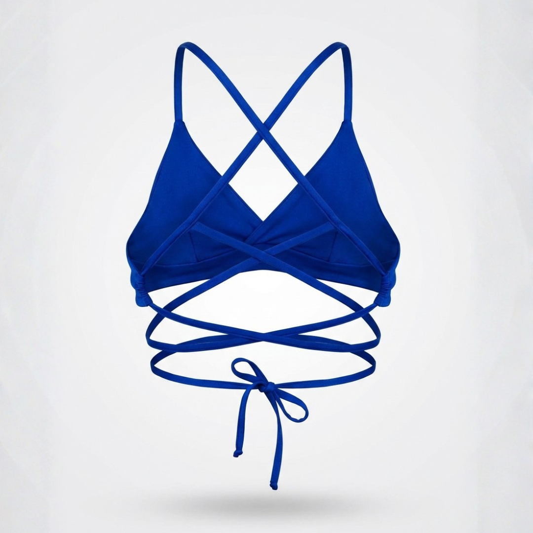 Bralette minimalista con escote redondo profundo y espalda descubierta en X con tirantes largos ajustables a la cintura
